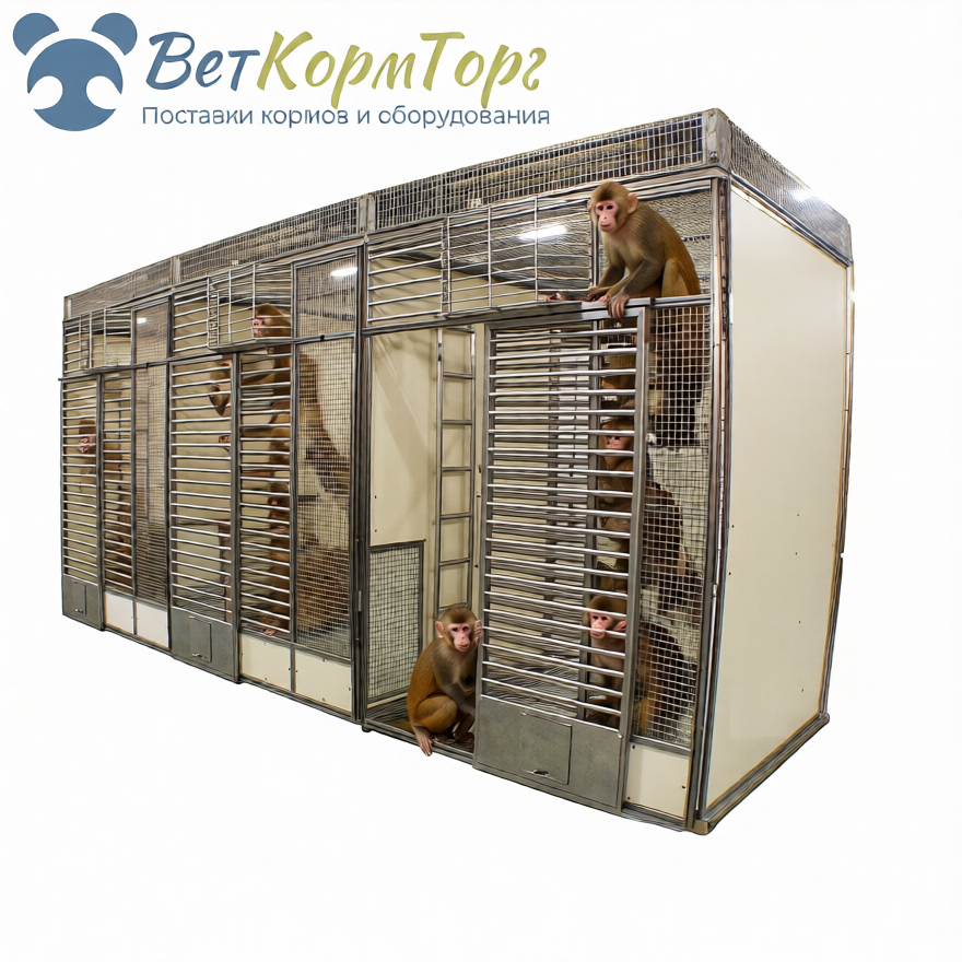 Блок группового содержания приматов от компании ВетКормТорг изготовленный из нержавеющей стали марки 304, стандартный набор панелей включает в себя:
