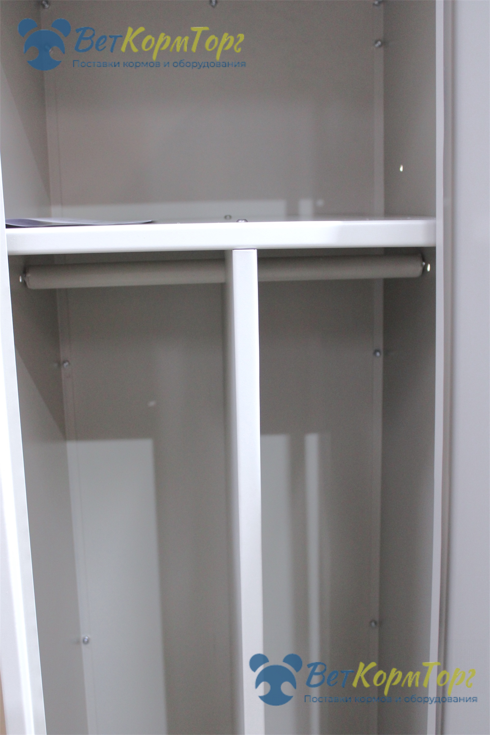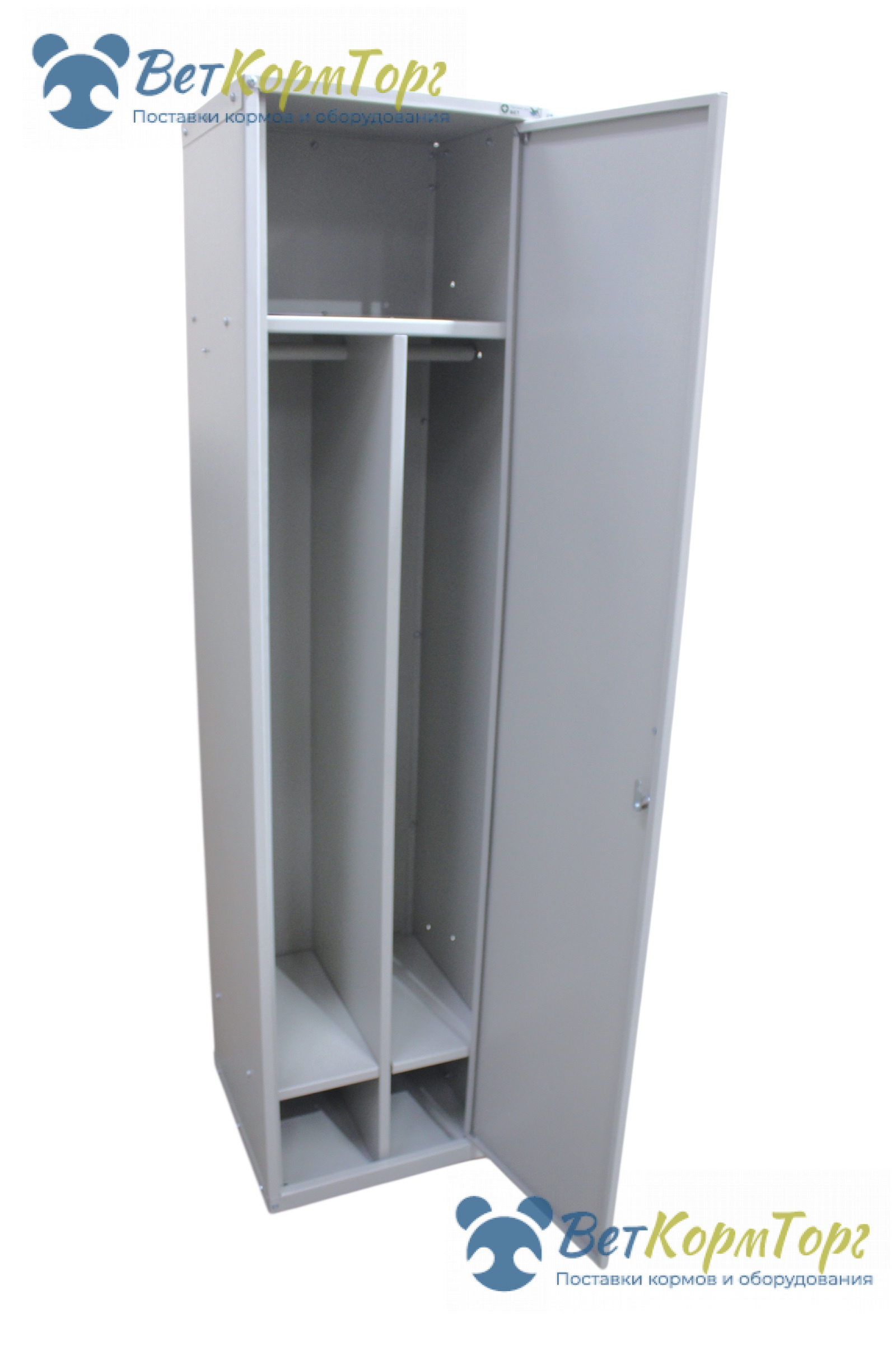 Предусмотрена перегородка из металла, которая разделят шкаф на 2 части по вертикали, для чистой и грязной зоны одежды. Предусмотрена штанга металлическая для вешалок. Есть замок.