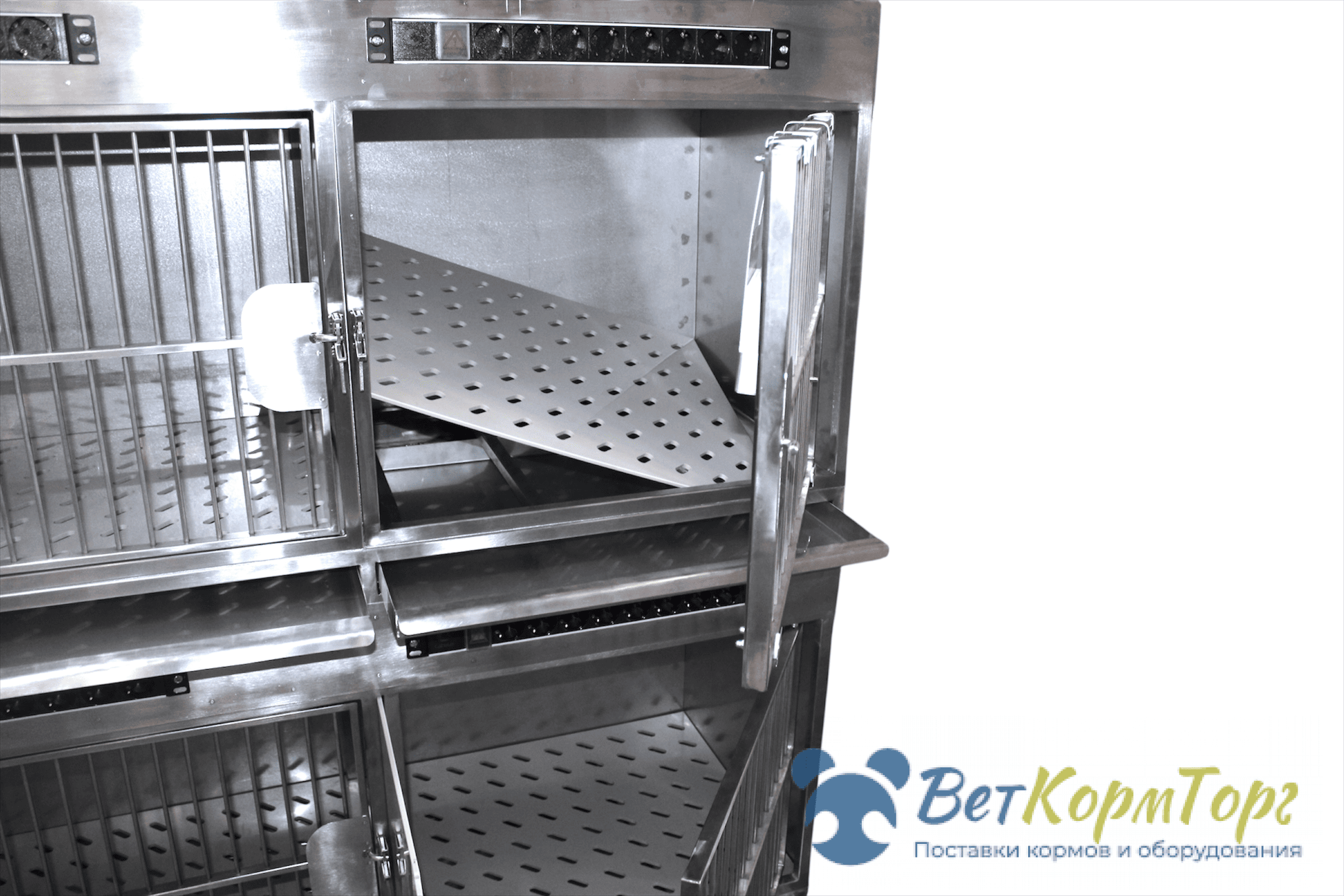 Аналогичное оснащение: перфорированный пол, поддон, безопасные дверцы с самозакрывающимися замками и защитными накладками.