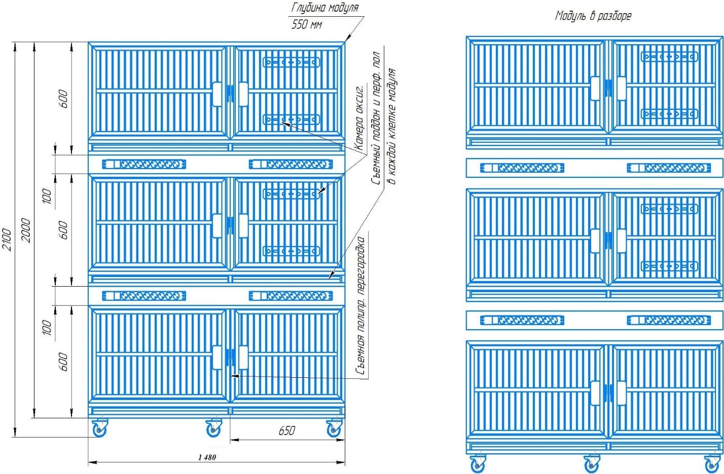 Габариты клеток: левая (830x550x600 мм), правая (650x550x600 мм).