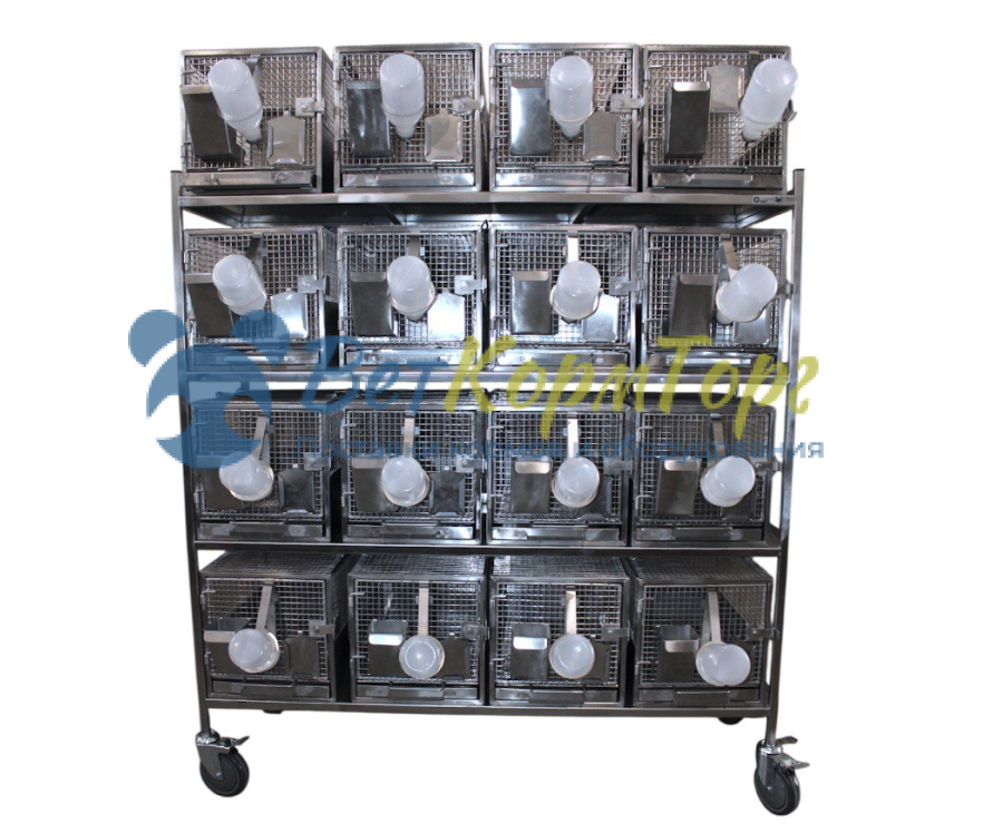 Стеллаж с четырьмя полками, на которых расположено по 4 клетки.